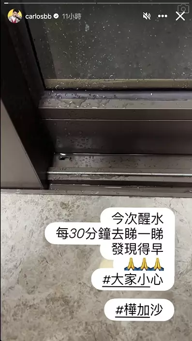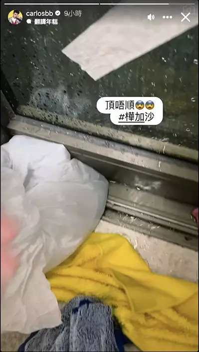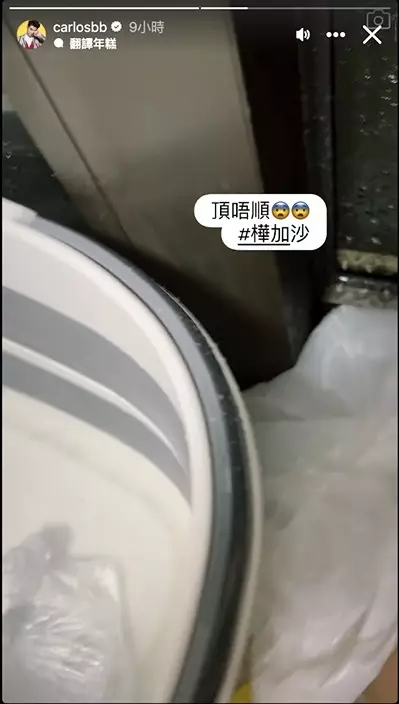 然而,努力最終未能抵擋狂風暴雨。短短兩小時後,雨水再次從窗邊縫隙瘋狂湧入,場面就如「室內噴水池」重現陳宅!影片中可見,陳家樂急忙用毛巾、膠袋堵塞縫隙,旁邊更放了水桶死守,但水位仍持續上升,狼狽非常。他無奈地拋下三個字:「頂唔順。」字裡行間盡是無力感。