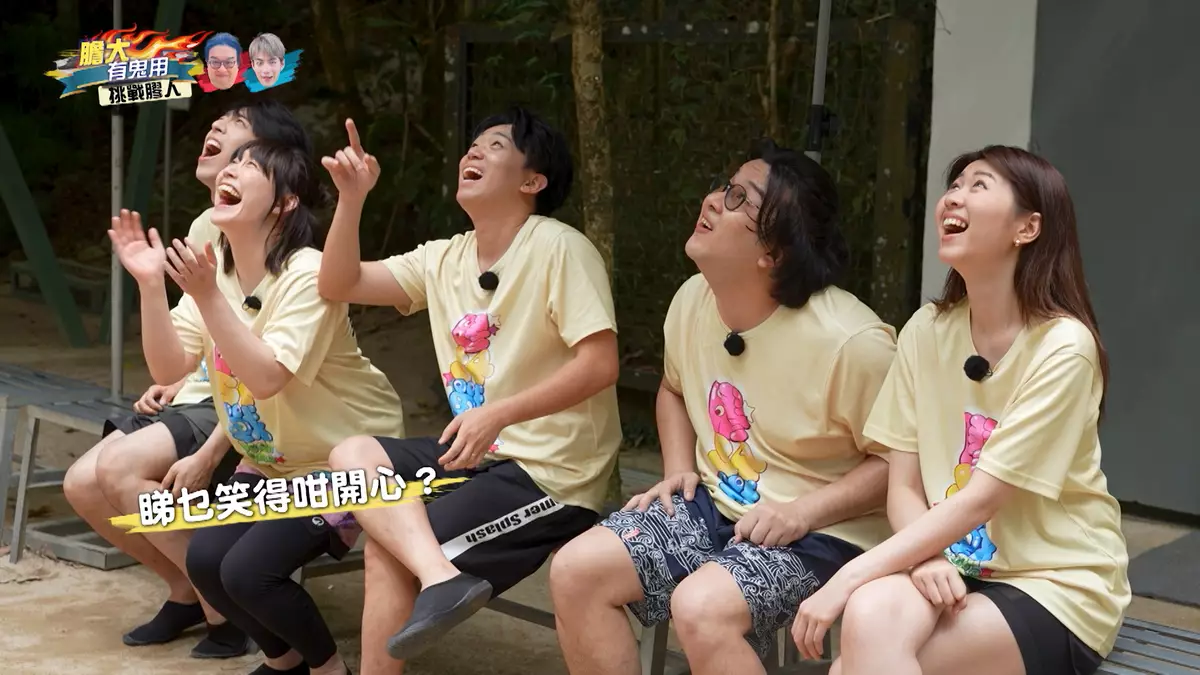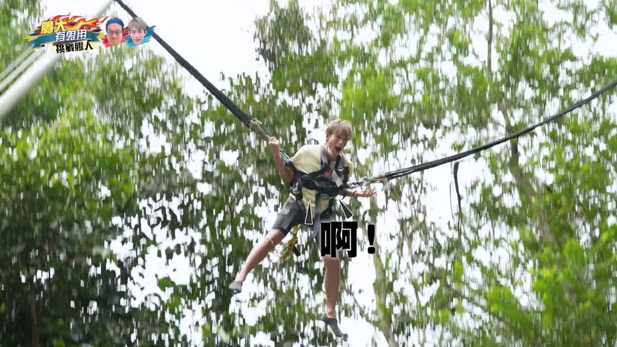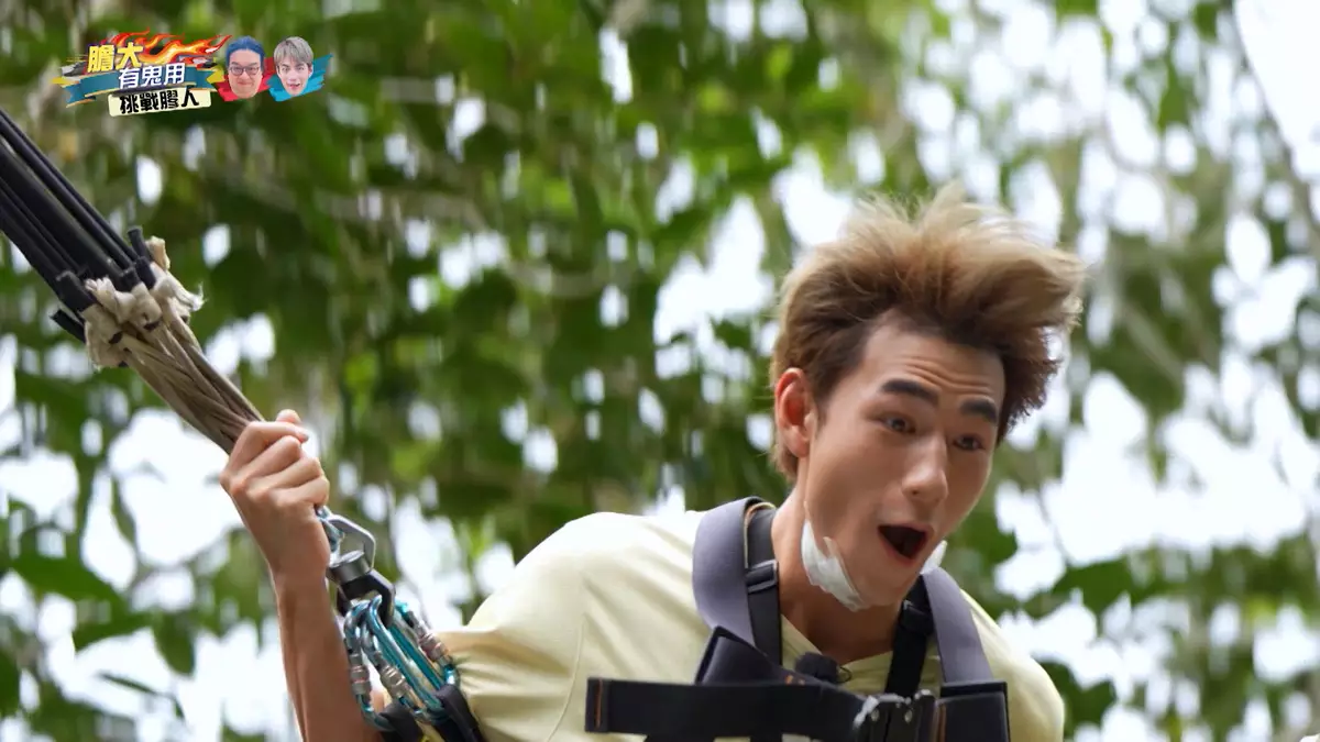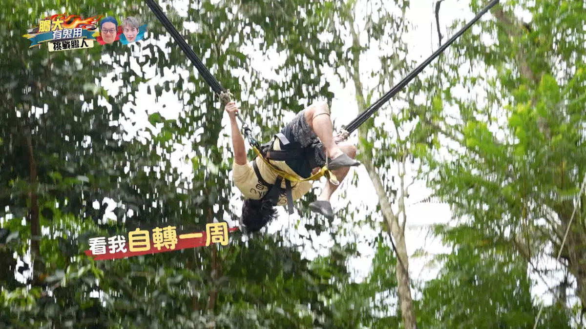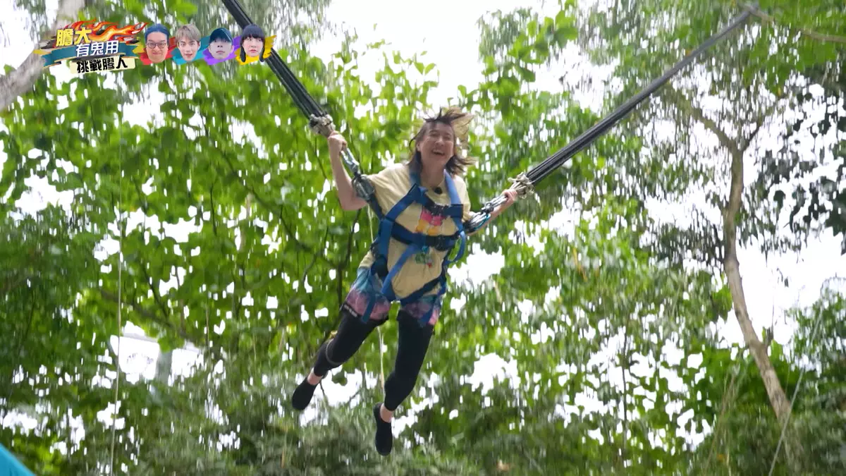 肥腸率先試玩遊戲,只見他全程表情從容,還在空中翻騰一周,直言輕鬆無難度。輪到Jeffrey挑戰,阿正問他可否在被彈上空中時,嘗試一直保持帥氣表情,Jeffrey即時以一個招牌單眼回應,顯得非常淡定。不過,遊戲一開始Jeffrey已表情管理失敗,更連番尖叫,其餘5膠見狀亦瘋狂取笑他。