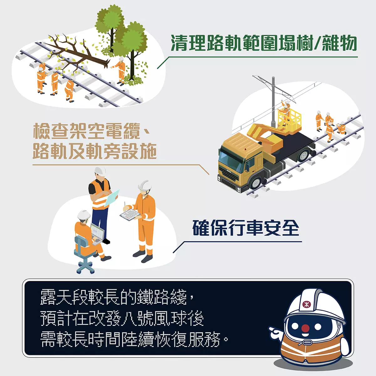港鐵陸續恢復服務,但由於東鐵綫由大埔墟站至羅湖及落馬洲站過境路段,有較嚴重的塌樹及架空電纜損壞情況,預計相關路段最少在黃昏過後,才可逐步恢復服務。
