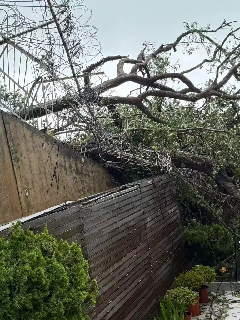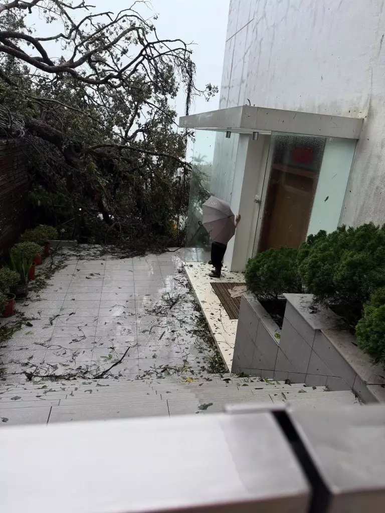 從阿姐上傳的照片可見,一棵高大樹木倒塌後直接壓向其寓所外牆,部分樹枝更插入花園範圍,導致出入通道受阻。她發文寫道:「牆外大樹倒冧,橫插我家花園,阻住了通道出入。」雖遇突發狀況,阿姐仍保持樂觀,強調:「希望明天可以順利出門拍劇。大家小心!」其敬業精神獲網民讚賞。