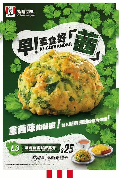 「早!要食好「茜」! KFC今次反轉「茜」式早餐新槪念,將招牌香蜜鬆餅融入備受熱議的芫茜元素,帶來多「茜」層次豐富的口感體驗!「爆茜香蜜鬆餅」由9月25日起限時三周供應,廣大的芫茜迷絕對不能錯過!