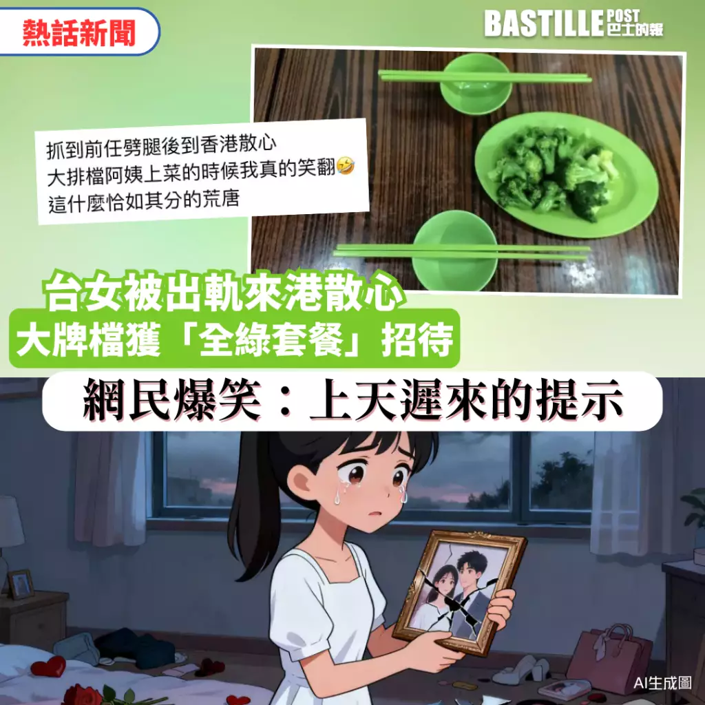 一名台灣女生因發現男友「偷食」而分手,特地來香港旅遊散心,未料在富有本地特色的大牌檔用餐時,點了一碟西炒花,竟被店家以「全綠套餐」招待!
