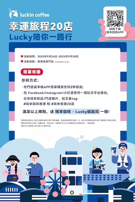 為感恩回饋本地消費者支持,瑞幸預計於本週開啟「20店同慶」限時全線門店優惠活動,推出包括優惠禮券、限定禮品等多重好禮。消費者只需同一訂單購買任何2杯飲品,並在Facebook、Instagram或小紅書發文,即有機會獲贈限定禮品。有關活動詳情,請關注全港各門店現場相關說明。