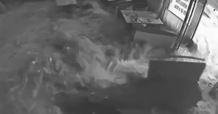 將軍澳臨海餐廳在樺加沙襲港期間被大浪湧入而受嚴重破壞。Threads影片截圖
