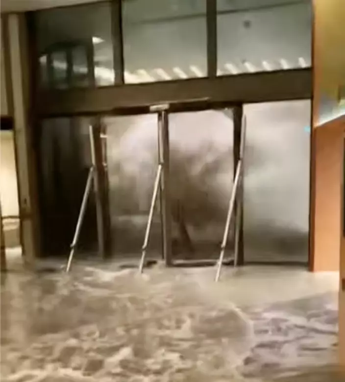 南區一間酒店星期三(9月24日)在10號信號下,大堂玻璃門被海浪沖毀,大量海水湧入。