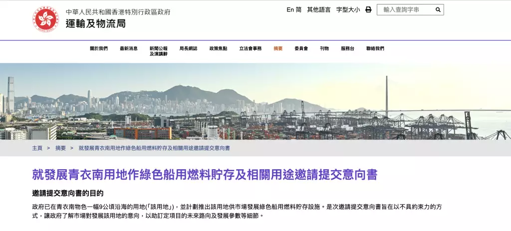 運輸及物流局邀請業界提交有關在青衣南用地發展綠色船用燃料貯存設施的意向書。