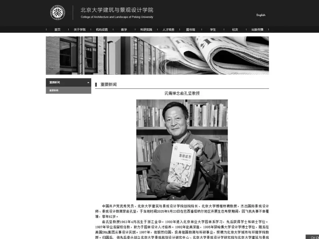 事發在當地周二晚,一架小型飛機在巴西中西部阿基道阿納市墜毀,機上四人全部遇難,其中一人是俞孔堅。當地傳媒報道,俞孔堅當時正在潘塔納爾濕地拍攝一部關於「海綿城市」的紀錄片。