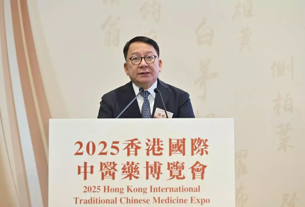 政務司司長陳國基出席2025香港國際中醫藥博覽會開幕典禮致辭。政府新聞處圖片