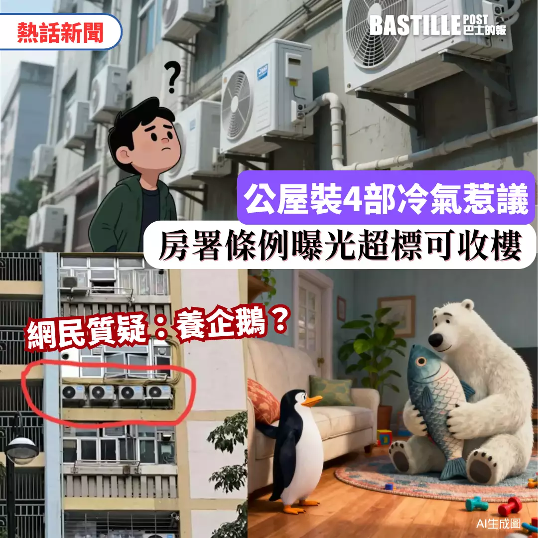 從網民分享至Facebook群組的照片可見,有一單位外牆密集地安裝了4部分體式冷氣機,對比鄰居僅1部顯得格外突出。樓主疑惑「咩情況要裝4部冷氣」,引來留言戲稱「養企鵝?」、「北極熊之家」。亦有人質疑是否涉及「一屋多戶」或分間套房(劏房),建議房署巡查。