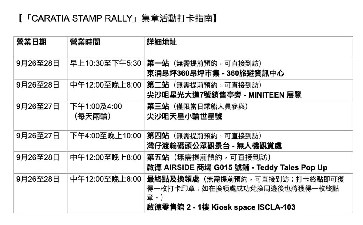 為了讓CARAT們在演唱會之外也能享受沉浸式的「痛城」體驗,官方再宣布於9月26日至28日舉辦為期三天的「CARATIA克拉境 STAMP RALLY」集章活動,活動範圍涵蓋香港多個熱門景點,CARAT們於各點皆可領取專屬打卡紙;集齊印章更有機會換取多款香港限定紀念品!本文以下為大家整理六大打卡點攻略: