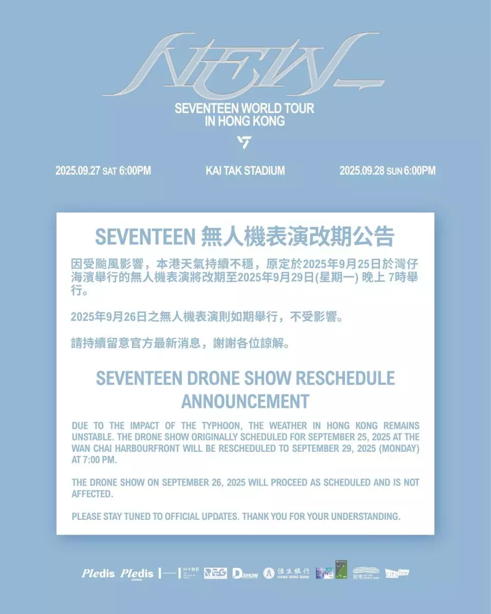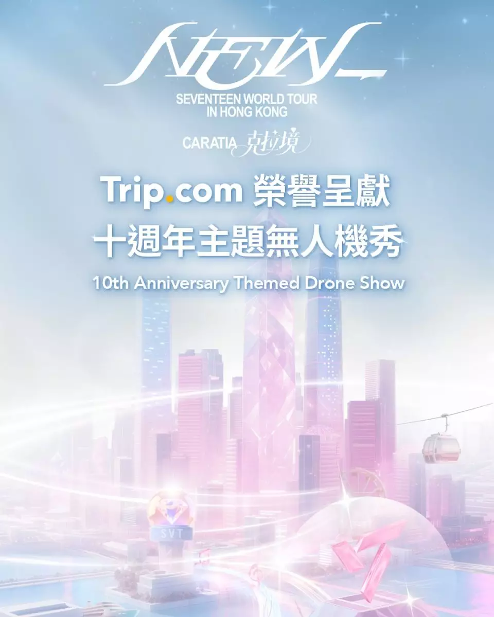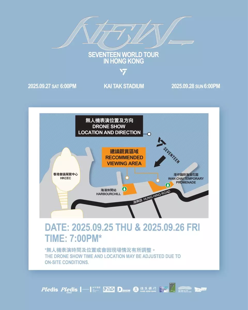 主辦單位特別於演唱會期間打造專屬無人機視覺盛宴!分別於9月26、27、29日上演以SEVENTEEN為主題的無人機表演,千架無人機將以維港夜空為畫布,呈現SEVENTEEN經典符號與震撼舞台場景!各位CARAT亦可自行攜應援物,創造專屬CARAT的星光海洋,官方亦特意在觀景台上設置「STAMP RALLY」印章打卡點,粉絲們切勿錯過!