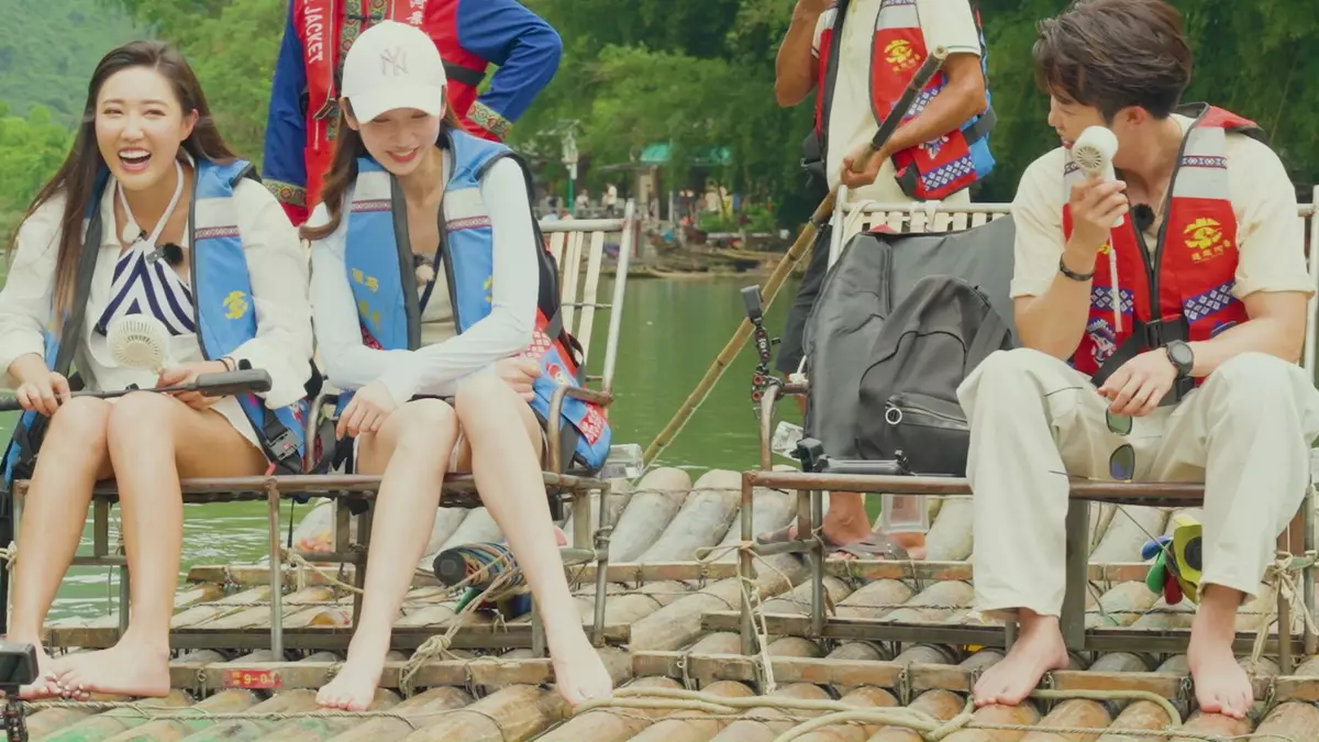 三人乘坐竹筏欣賞灕江景色,但Cathy似乎想踩沉Leonard隻竹筏?