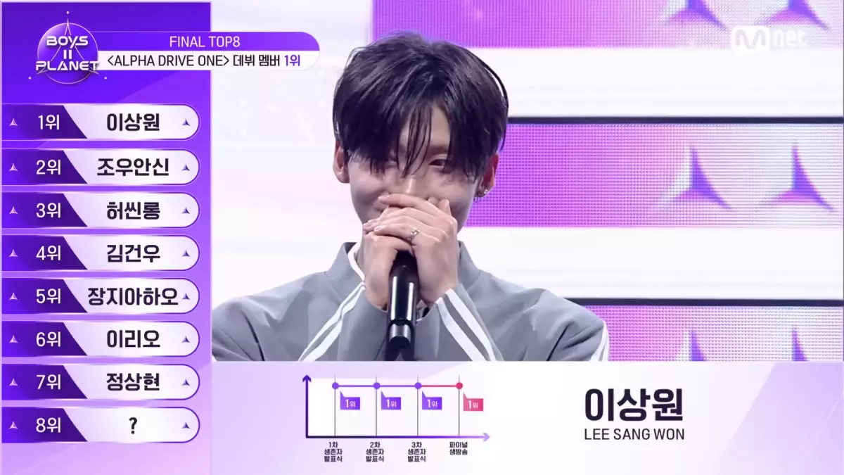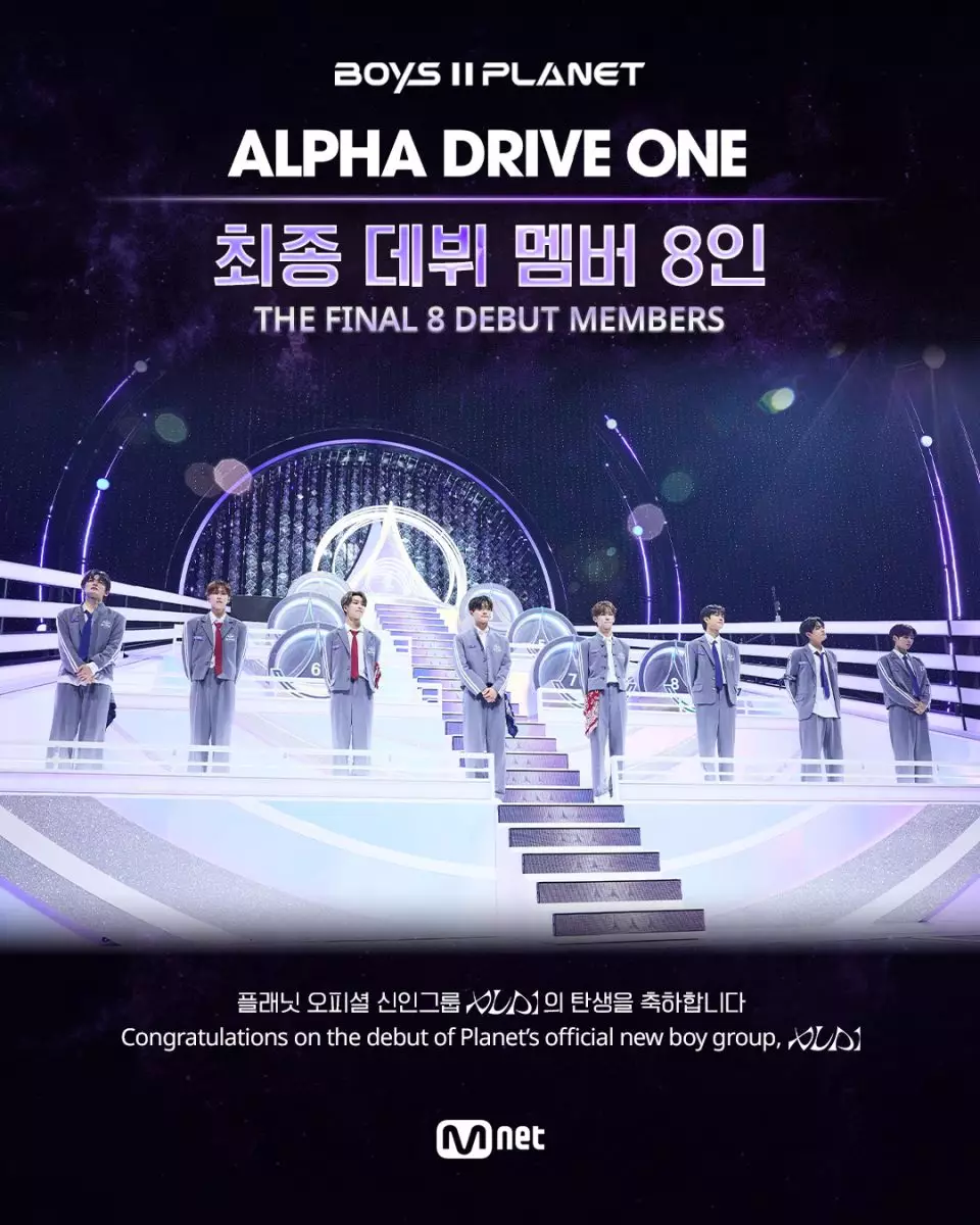韓國Mnet大型選秀節目《BOYS II PLANET》於9月25日晚舉行總決賽,經過數月激烈比拚,全球粉絲票選的8人出道名單終於揭曉!由李相沅以729萬3777票摘下冠軍寶座,領軍周安信、賀鑫隆、金虔佑、張家豪、李理悟(Leo)、鄭相炫、金俊抒,組成限定男團「Alpha Drive One」(簡稱ALD1),準備席捲全球歌壇!