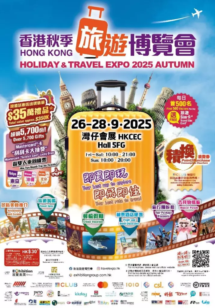 由展覽集團主辦、香港旅遊業議會協辦的「香港秋季旅遊博覽會2025」26日正式開幕,展期於香港會議展覽中心舉行。今次博覽會匯聚超過300個展位,涵蓋來自全球的企業和旅遊機構,市民可一站式獲取最新旅遊資訊及優惠。
