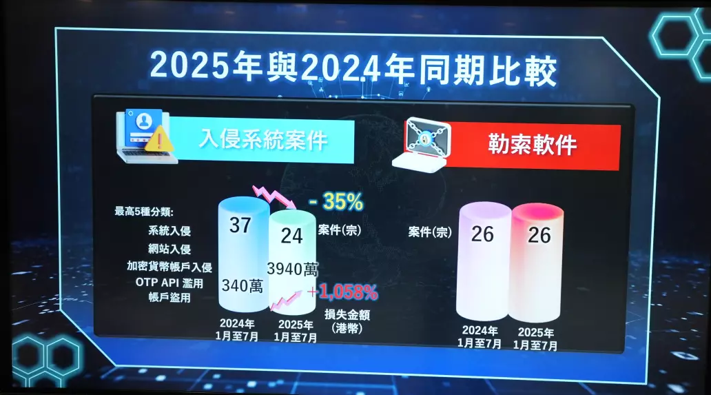 在入侵系統案件方面,數字由去年同期37宗下降至24宗,但涉及損失卻由340萬港元急升至3,940萬港元,升幅超過10倍,反映單一案件破壞力愈趨嚴重。