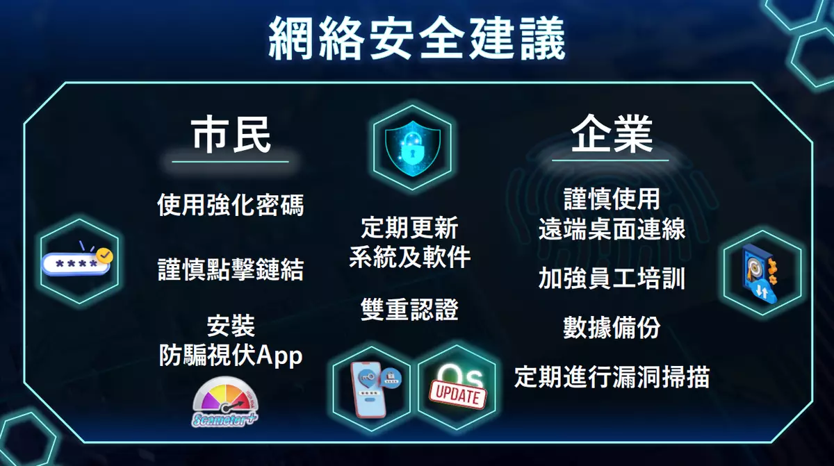 警方呼籲市民及企業保持警覺,措施包括:使用強化密碼並啟用雙重驗證;定期更新系統、關閉不必要的遠端功能;謹慎點擊來歷不明連結或附件;安裝「防騙視伏App」,使用來電警示、網站偵測及公眾舉報三大功能。