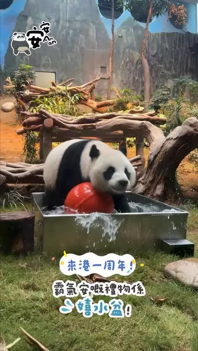 人稱「安總」、「安少」的安安,收到的禮物是嬉水盆,但向來Jap Jap Jap不停的安少堅持一定要食飽才肯落水開P。不過,嬉水盆看來有點太細了,XL型的霸氣安總一落水,施設空間就所餘無幾,奶爸奶媽下次要加碼了。