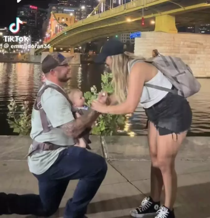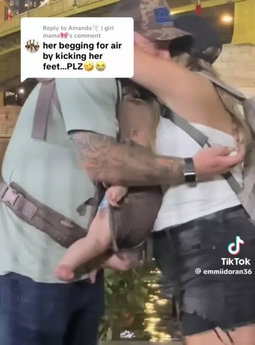 影片可見,男友單膝跪地拿出戒指求婚,多蘭隨即答應並難掩喜悅,之後用力撲進男友懷中。然而,男友胸前正好揹著嬰兒,多蘭的擁抱令嬰兒面部瞬間被「夾擊」,差點不能呼吸。只見嬰兒雙腳在半空中不斷踢動掙扎,場景相當驚險。