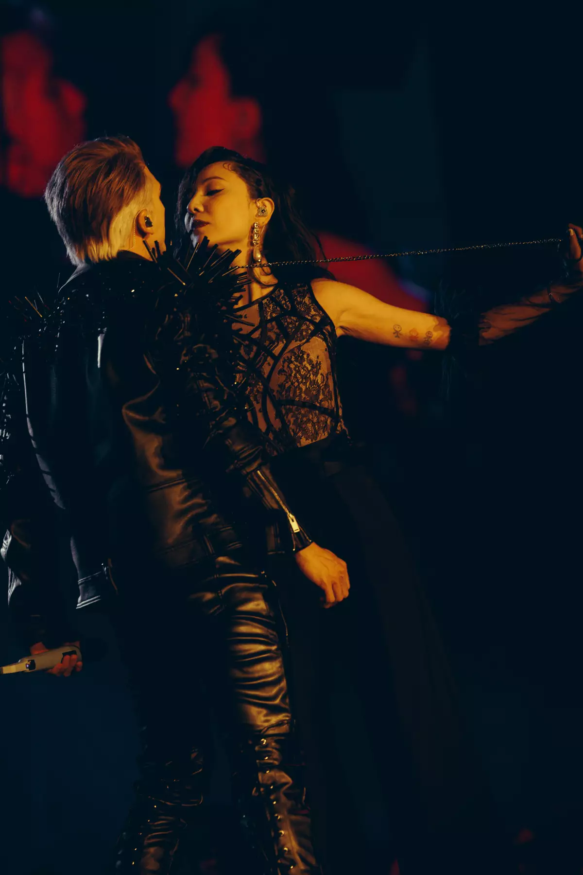 除了自己solo,Kenny又請來久未現身香港舞台的鄭希怡(Yumiko)合唱《相對濕度》及《閒人勿近》。這對組合的演出認真不得了,Yumiko拖住戴住皮鐵頸鏈的Kenny在台上爬行,上演一幕幕極盡誘惑的演出,看到台下觀眾血壓飆升。