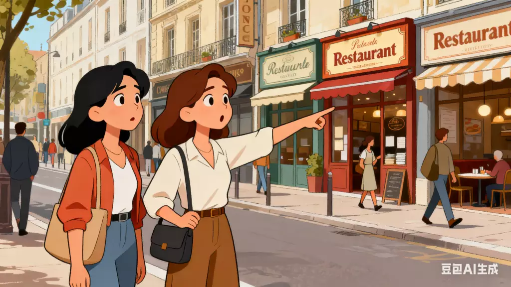 女事主與朋友在街頭隨意挑選食肆。AI生成圖