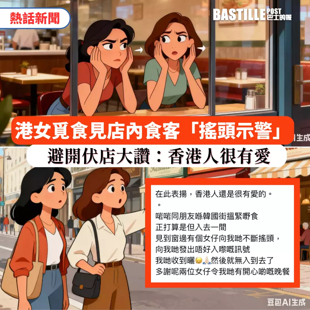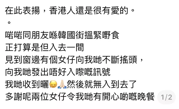 事主在帖文中表示,當時與朋友在韓國街正打算隨便進入一間餐廳用膳,卻發現店內窗邊有兩位女子不斷向他們搖頭,並發出「不要進來」的訊號。事主心領神會,立即與朋友離開,並感謝對方的提示,讓她們能有更愉快的晚餐體驗。