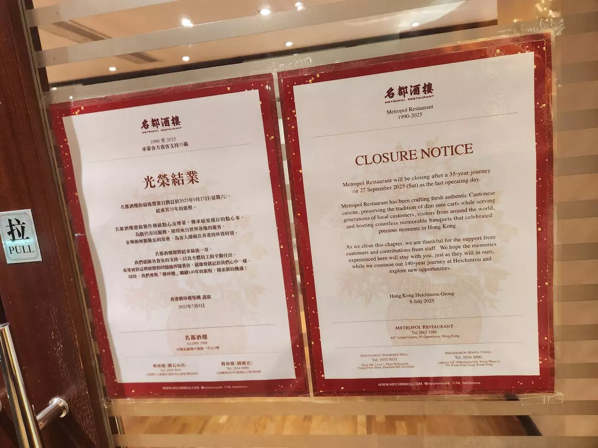 開業35年、位於金鐘統一中心的名都酒樓,晚上大約10時關門後正式結業。