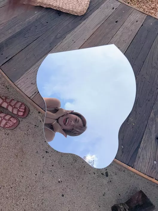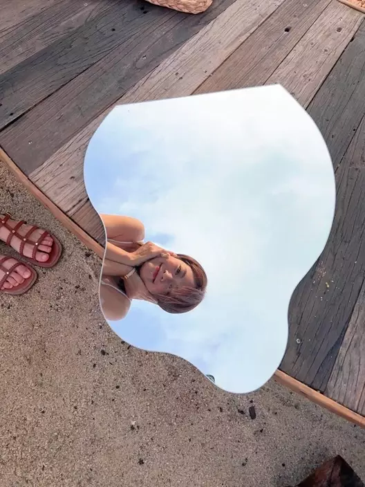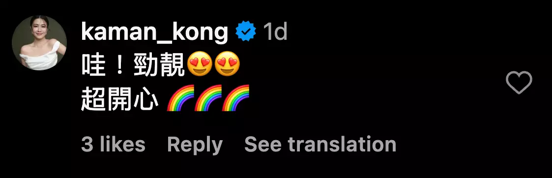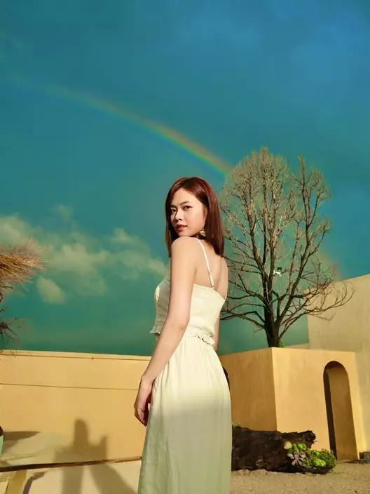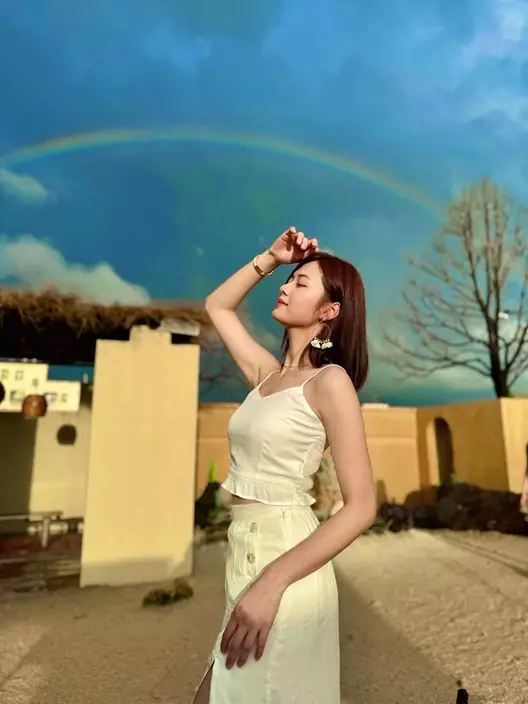 相中,游游穿著白色吊帶小背心搭配同色系長裙,大晒白滑美背,而鏡頭則由低向高仰拍她及身後的彩虹美景,畫面相當唯美;另外兩張相就見到游游對着鏡子擺出搞笑、趣致的表情,展示出她可愛調皮的一面,睇到網民心心,紛紛留言讚「靚」,連圈中好友江嘉敏都留言:「哇!勁靚!超開心!」