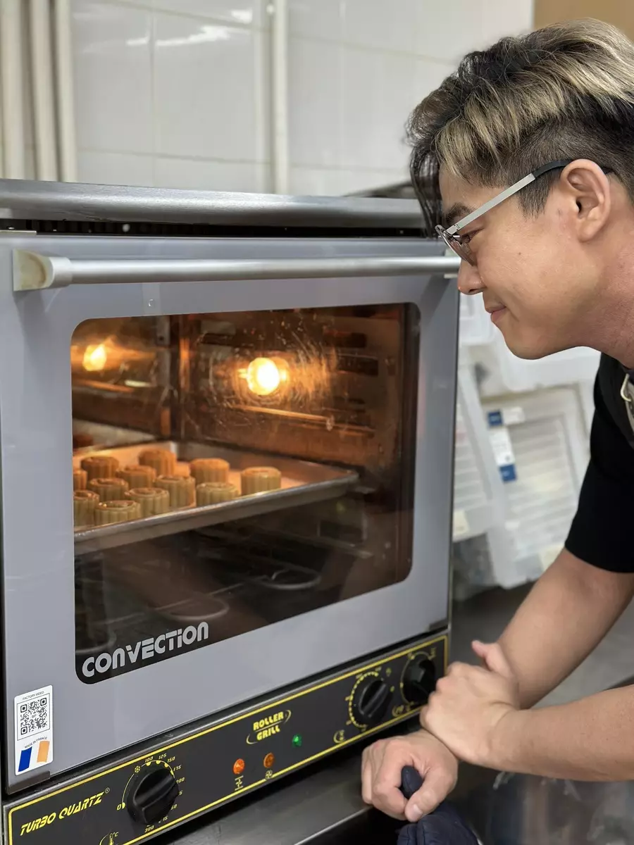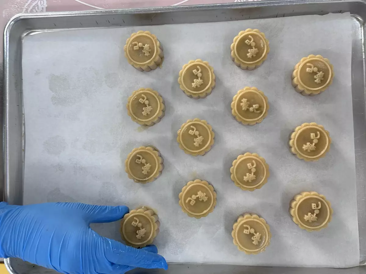 啟豪進行最後步驟,為月餅塗上蛋漿。