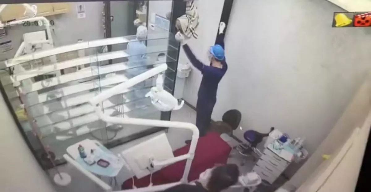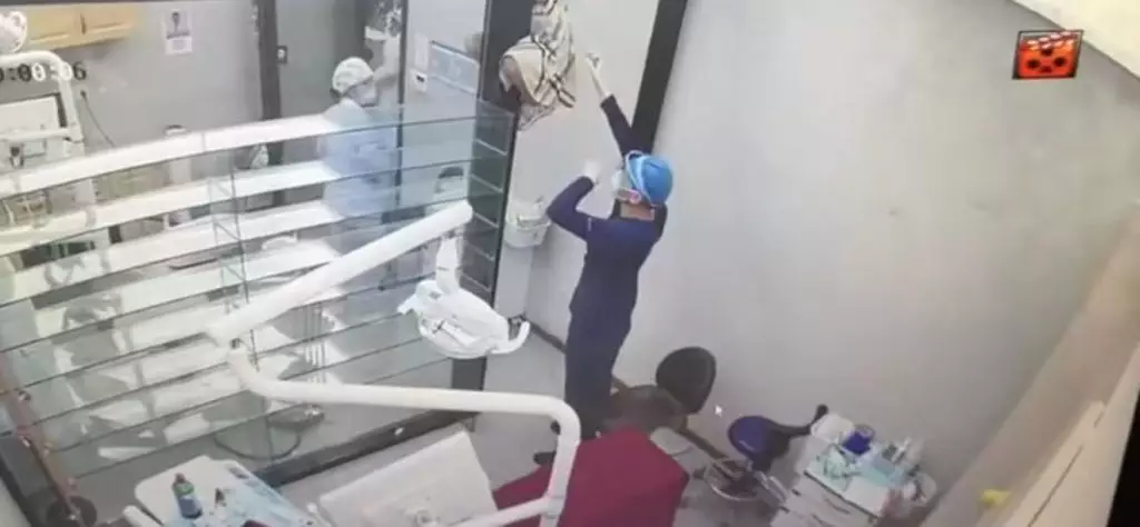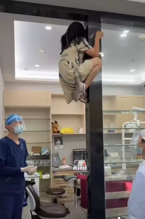 綜合內媒報導,江蘇鹽城一間牙科診所倍美永康口腔門診部於9月22日上演一幕「飛檐走壁」的趣味畫面。當天,醫生與護士正準備為一名女童進行治療,但對方明顯情緒不穩且十分抗拒。未等醫護人員安撫,女童突然從牙科椅上跳下跑向門口,之後沿門框攀爬而上,轉眼就爬到門頂,令在場醫護人員和家長哭笑不得。