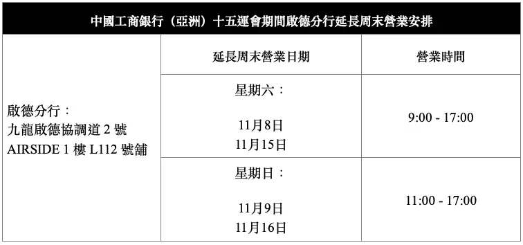 十五運會及殘特奧會是粵港澳首次共同承辦國家級大型綜合體育盛事,意義非凡。中國工商銀行(亞洲)秉持工商銀行「活力工行、全運同心、灣區同行」的核心主題,已構建覆蓋賽事全週期、服務全鏈條的金融保障體系,特別推出線上線下開戶迎新優惠、跨境支付、匯款、理財等系列專屬禮遇,呼應十五運會及殘特奧會的粵港澳跨境融合模式,打通跨境生活網絡,實現觀賽、消費、理財無障礙。本行同時以毗鄰香港賽區主要比賽場地之一——啟德體育園的全新啟德分行為支點,特別於十五運會期間延長該分行營業時間,提供便利金融服務。此外,本行全線分行均已完成「十五運主題形象升級」,打造傳播體育精神、增強國家認可的金融文化窗口,點燃全城熱情,為運動健兒呐喊助威。