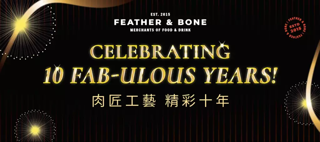慶典重頭戲「Cheers to 10 Years」週年派對將於10月16日盛大舉行。Feather & Bone銅鑼灣店將化身充滿活力的美食市集,供應多款精選葡萄酒、啤酒及由Four Pillars調製的Gin & Tonic,另更有多款美食如芝士牛扒三明治、香腸卷和Vili's餡餅等,每款均可以一個代幣換購(每個代幣只需港幣$10,最少購買十個),配以現場音樂表演,營造熱鬧歡樂的氛圍。