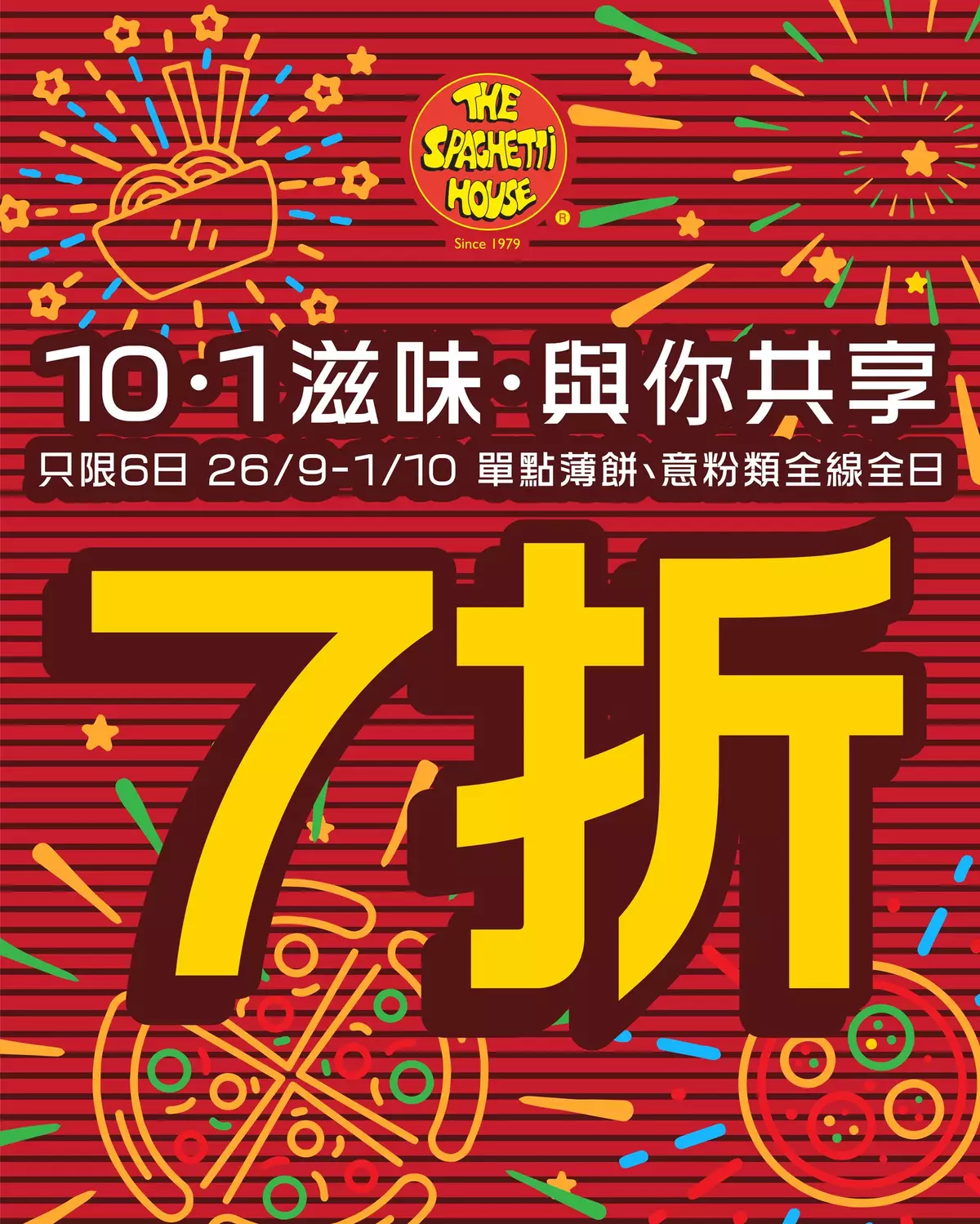 優惠: 惠顧薄餅類及意粉類,可享7折。