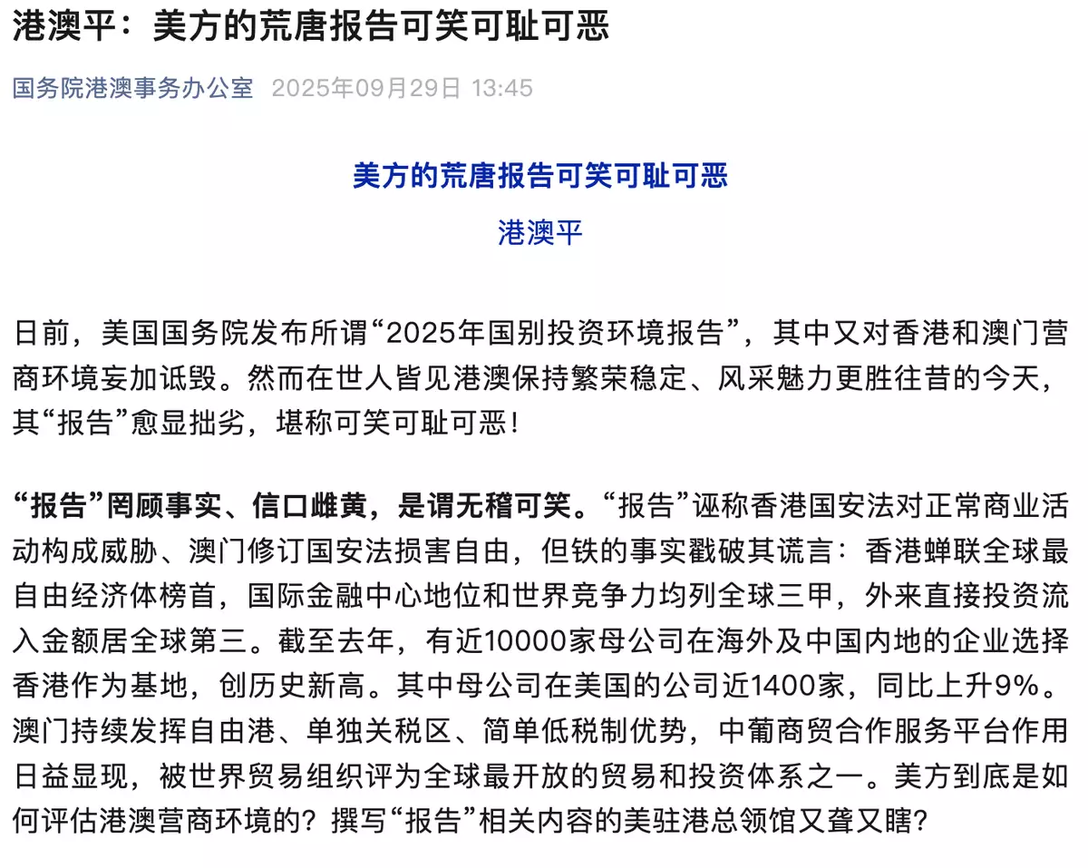 國務院港澳辦公室在微信公眾號發表「港澳平」署名文章,批評美國國務院投資環境報告詆毀本港營商環境。