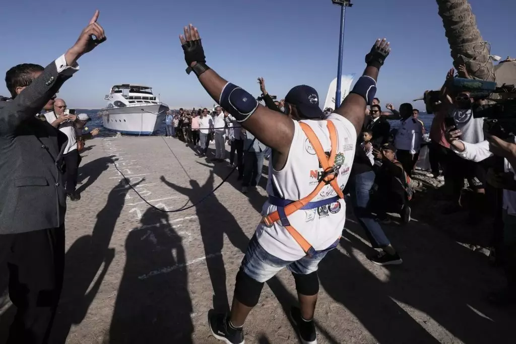 埃及大力士牙咬繩索拉動700噸巨輪,再戰世界紀錄。AP圖片