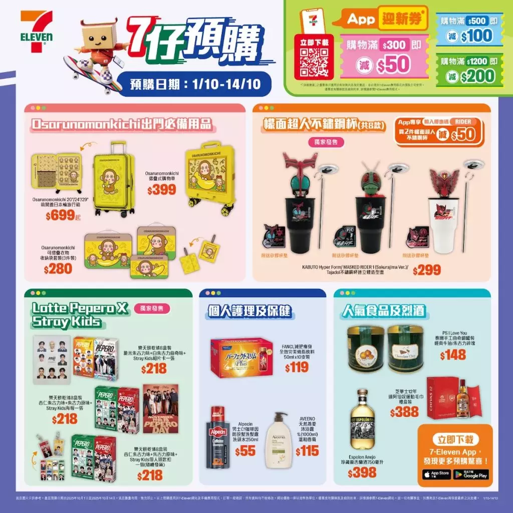 今次「7仔預購」另一驚喜預購必搶 —— 幪面超人不鏽鋼杯連立體造型蓋!共8款型格杯身搭配搶眼幪面超人立體頭像杯蓋,無論自用還是精品擺設都極具收藏價值。同場還有超人氣韓國 樂天餅棒 x Stray Kids專屬周邊組合預購,無論是動漫迷還是韓流控均可一次滿足。今期「7 仔預購」將於 10月 1日開始在「7 仔預購」網站 (https://www.7-eleven.com.hk/) 及 7-Eleven App (下載連結:https://qr1.be/XLQF) 雙平台開放預購。各位千萬不要錯過,一起搶購心水產品。