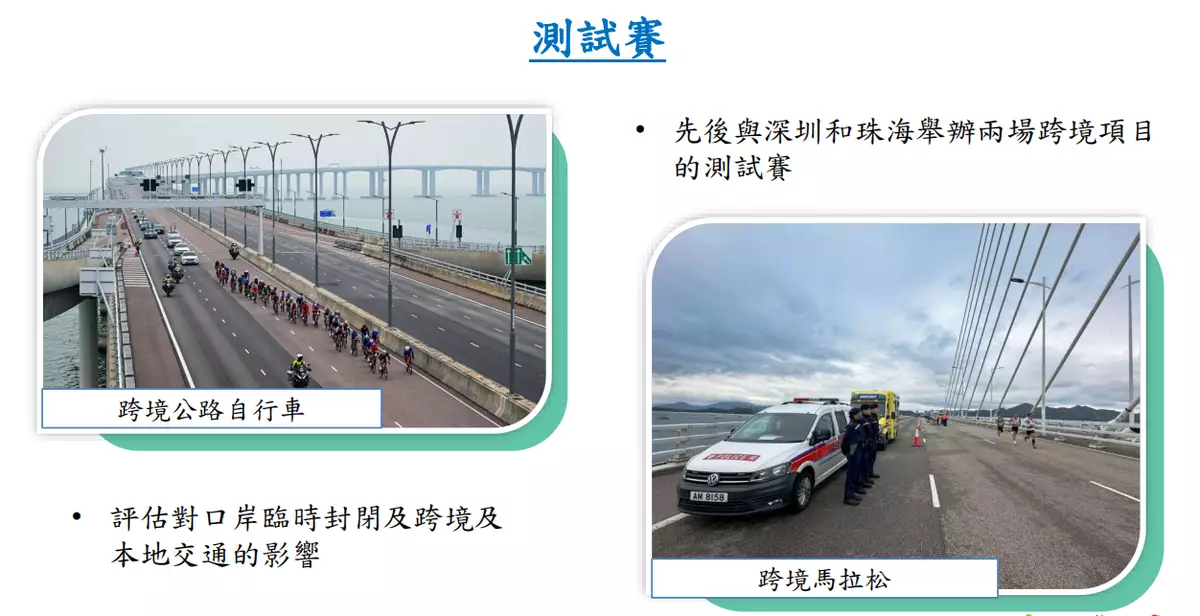 粉嶺高球賽將實施特別交通管制。跨境馬拉松需在封路3至4小時內完成佈置;公路自行車橫跨珠澳港,北大嶼山公路將實施滾動式封路,並在伸縮縫鋪膠墊,避免車手爆軚。