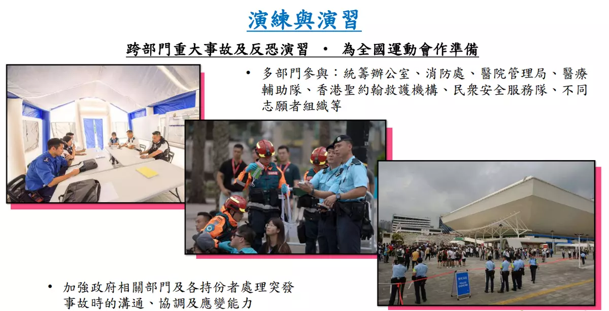 去年11月至今年6月,港區已完成多場測試賽,範圍包括場地安保、人流管制及交通疏導,並進行跨部門反恐及事故演練。