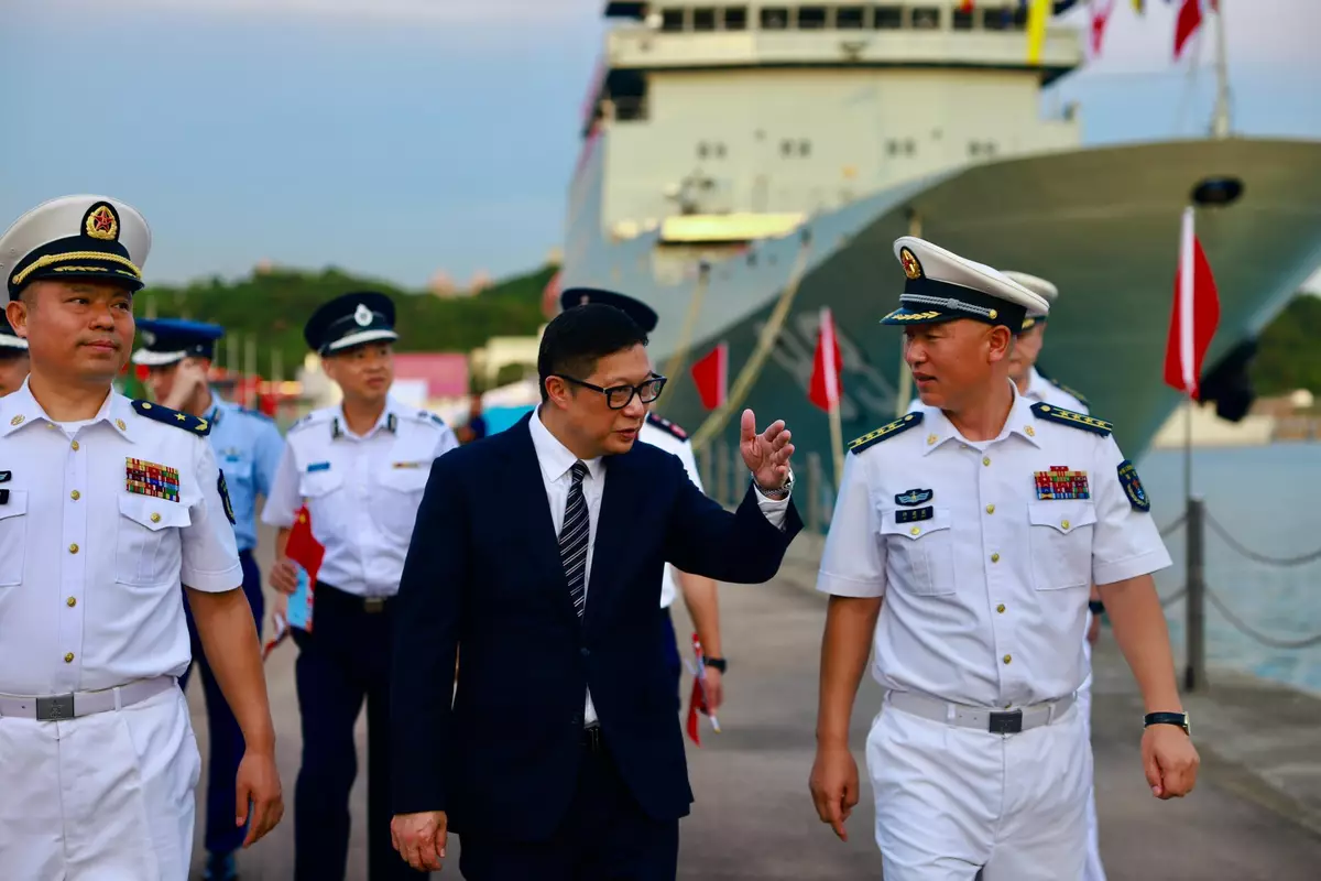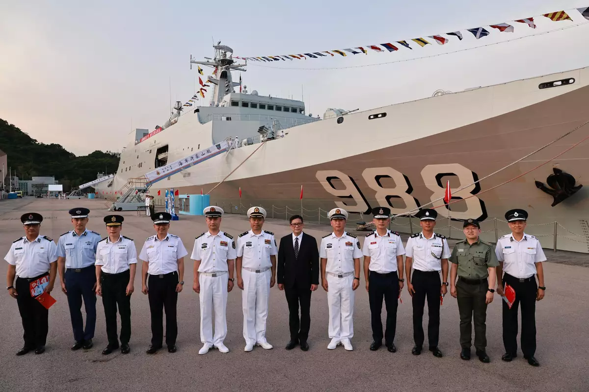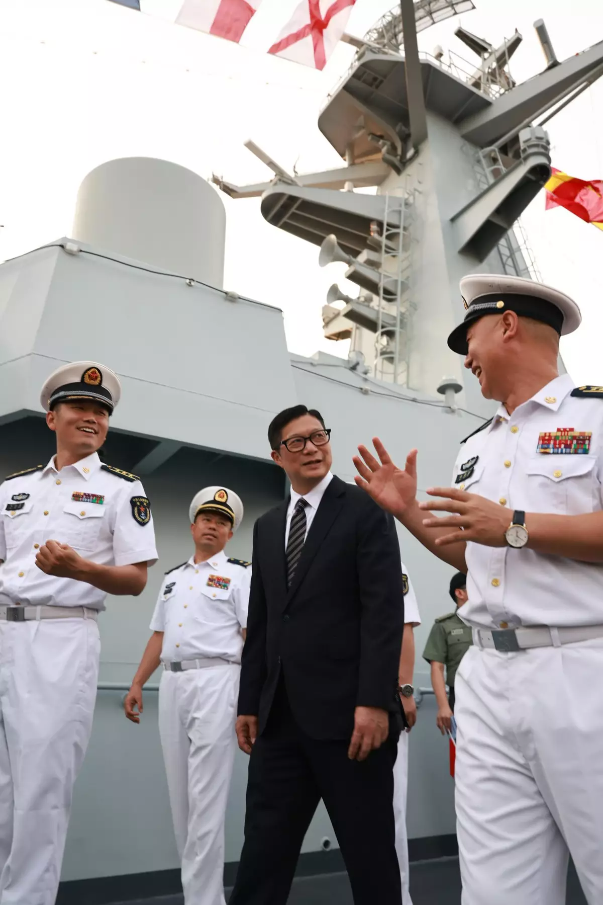 保安局局長鄧炳強下午同一眾紀律部隊首長代表登上首次訪港的戚繼光艦和沂蒙山艦參觀,並同解放軍海軍交流。