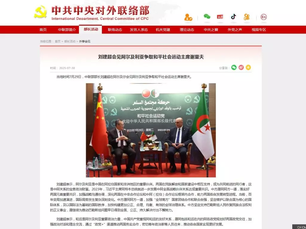 在中聯部網站「部長活動」一欄,最後一篇有關劉建超出席活動的報道,是在7月30日刊登。中聯部網站截圖