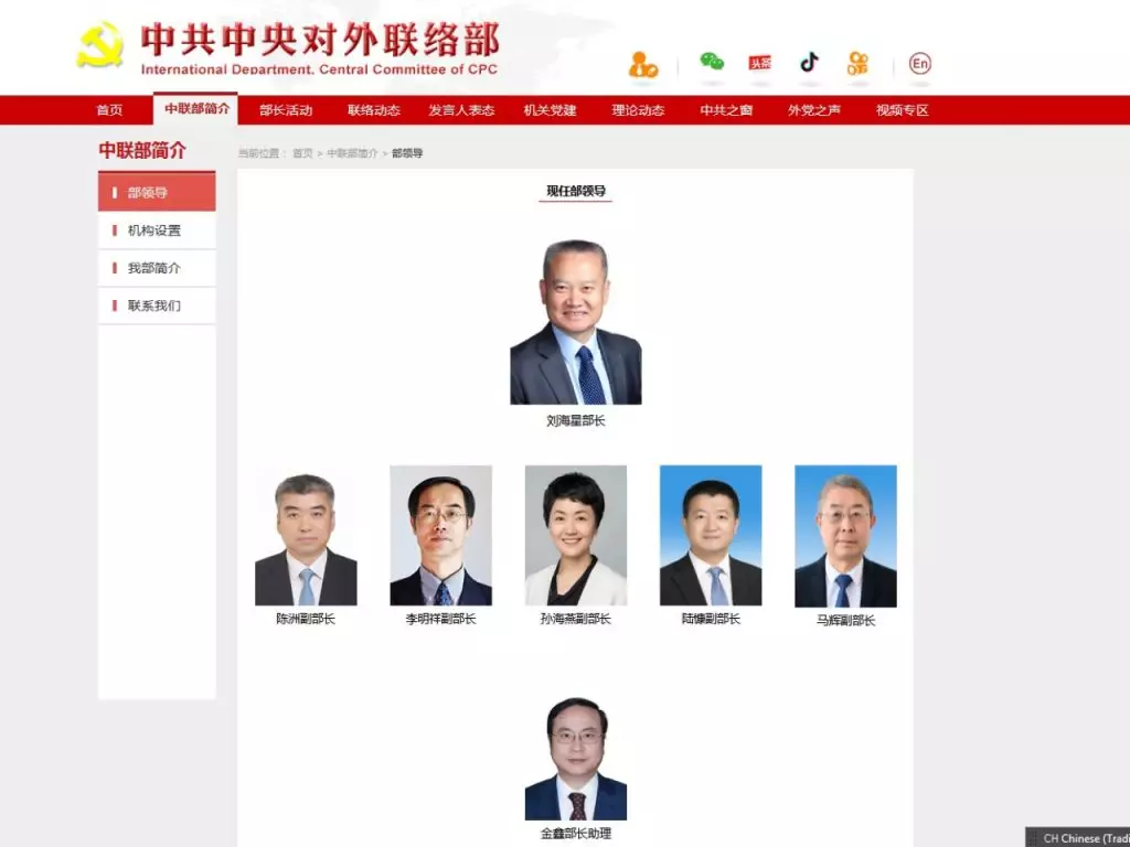 中聯部網站顯示,劉海星已出任部長。中聯部網站截圖
