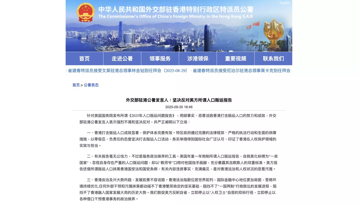 外交部駐港公署對美國國務院發布的「2025年人口販運問題報告」表示強烈不滿和堅決反對,批評報告罔顧事實、惡意詆毀香港打擊販運人口的努力和成效。