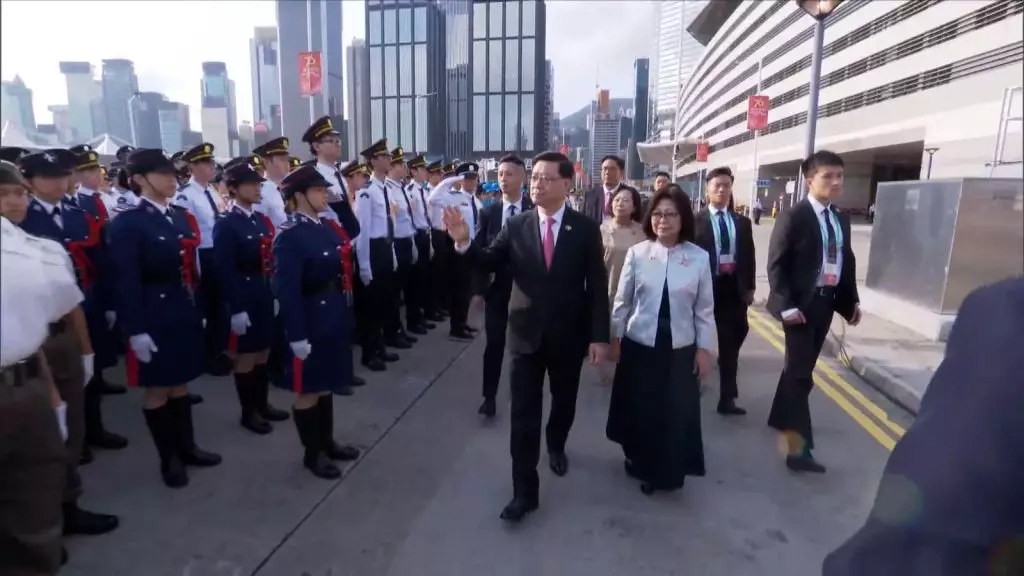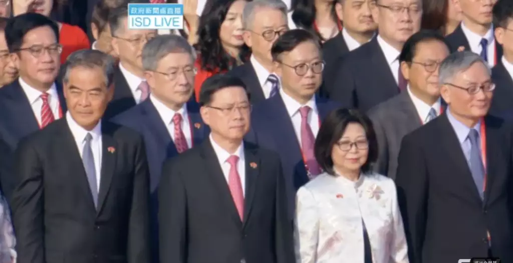 灣仔金紫荊廣場早上8時舉行升旗儀式,出席儀式的包括行政長官李家超伉儷。