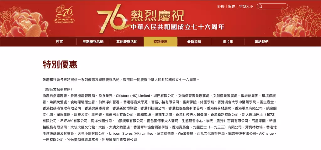 各項慶祝活動的更多詳情及優惠列表,可瀏覽專屬網站:https://www.nationalday76.gov.hk/tc/offer.html。陳國基呼籲大家立即計劃國慶行程,齊賀國慶,共創美好回憶。