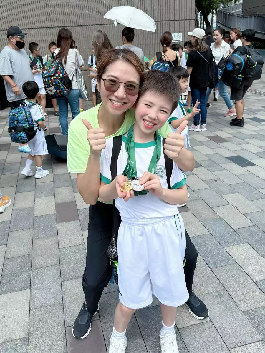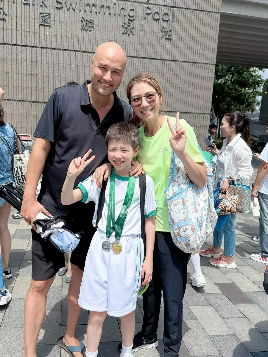 車婉婉日前和老公一同化身「粉絲」,出席囝囝BBQ學校一年一度的水運會,兩公婆的心態都是志在參與,希望囝囝盡力做好、享受過程就好,但BBQ的實力就令他們喜出望外,因為BBQ報了三個項目,分別是50米自由式、50米背泳及25米蛙式,而且都贏到獎牌,早年參加過但被DQ的25米蛙式更奪得金牌,非常叻仔!車婉婉大讚:「BBQ,你今年攞咗三個奬牌,証明你這一年嘅努力並沒有白費但係不要驕傲,要繼續努力呀!PaPa MaMa會繼續陪伴支持你㗎!」