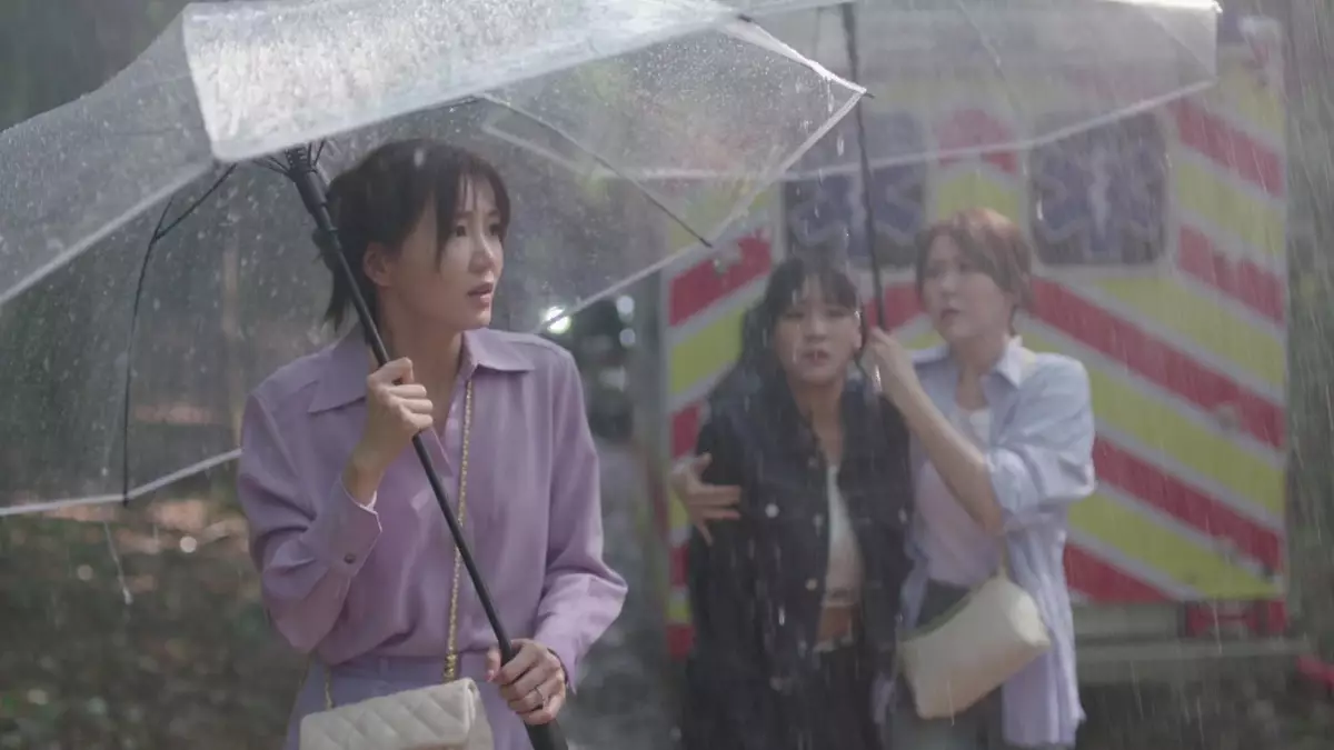 吳若希、劉佩玥和女兒樂珈嘉來到滂沱大雨的墜機現場。