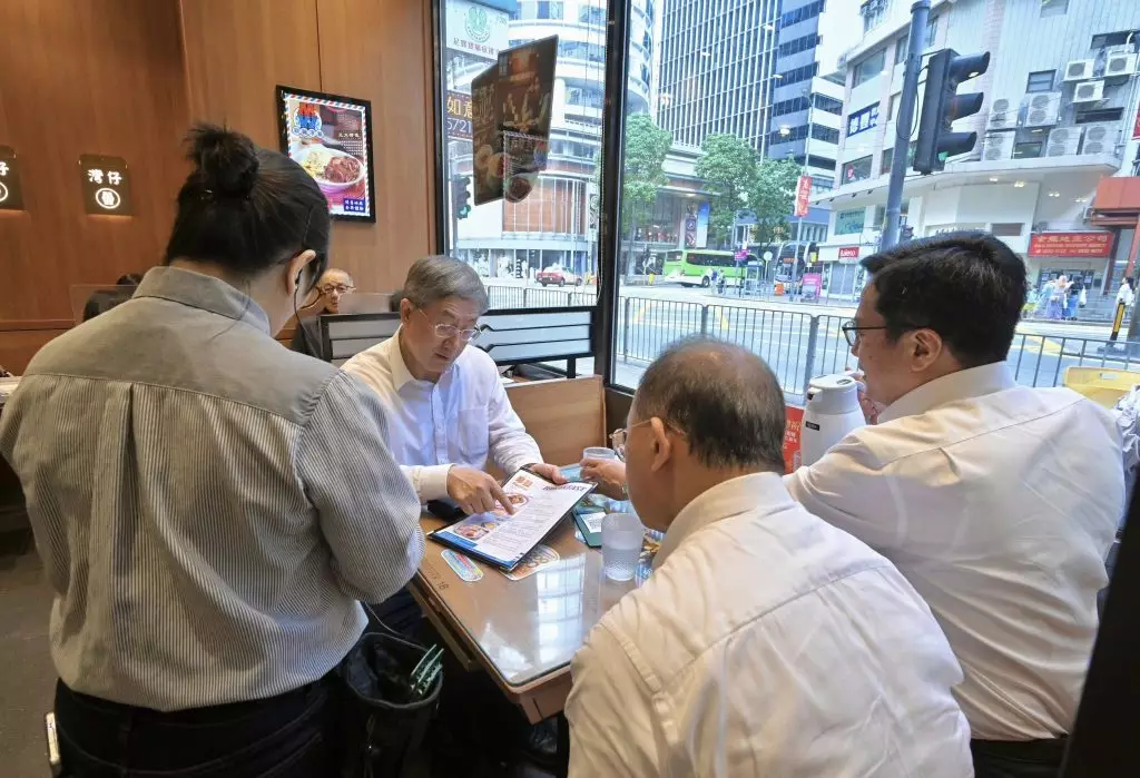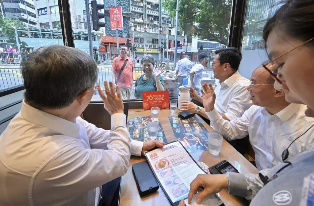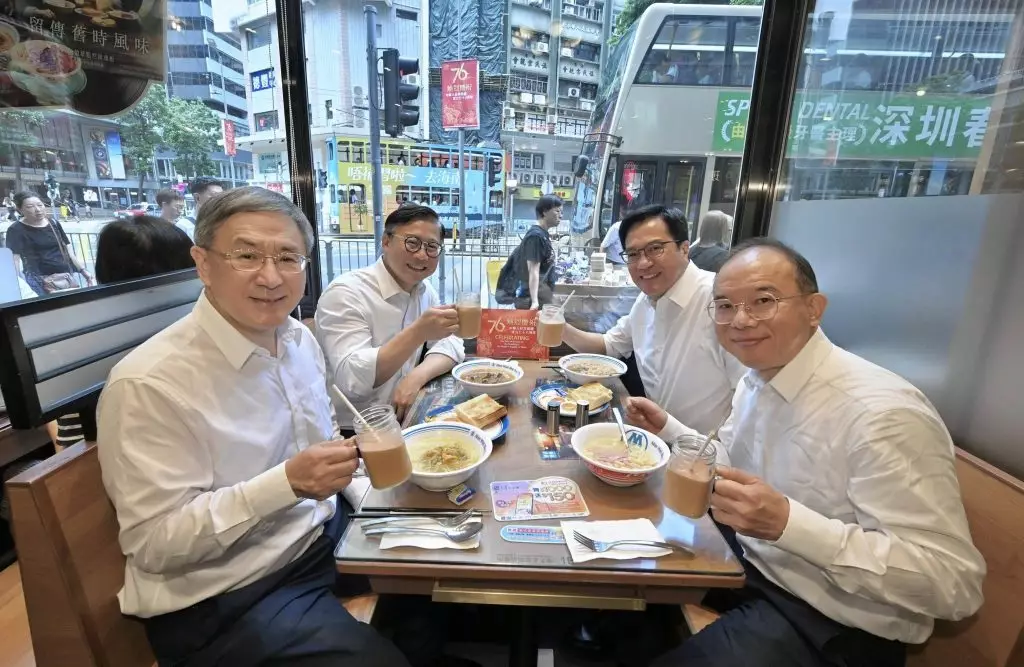 今年有破紀錄的三千多間食肆響應政府號召,為國慶76周年推出各種優惠,政務司副司長卓永興與財政司副司長黃偉綸、律政司副司長張國鈞及政制及內地事務局局長曾國衞,早上到灣仔一間提供全日全單7折的茶餐廳吃早餐,大讚「超級抵食」。