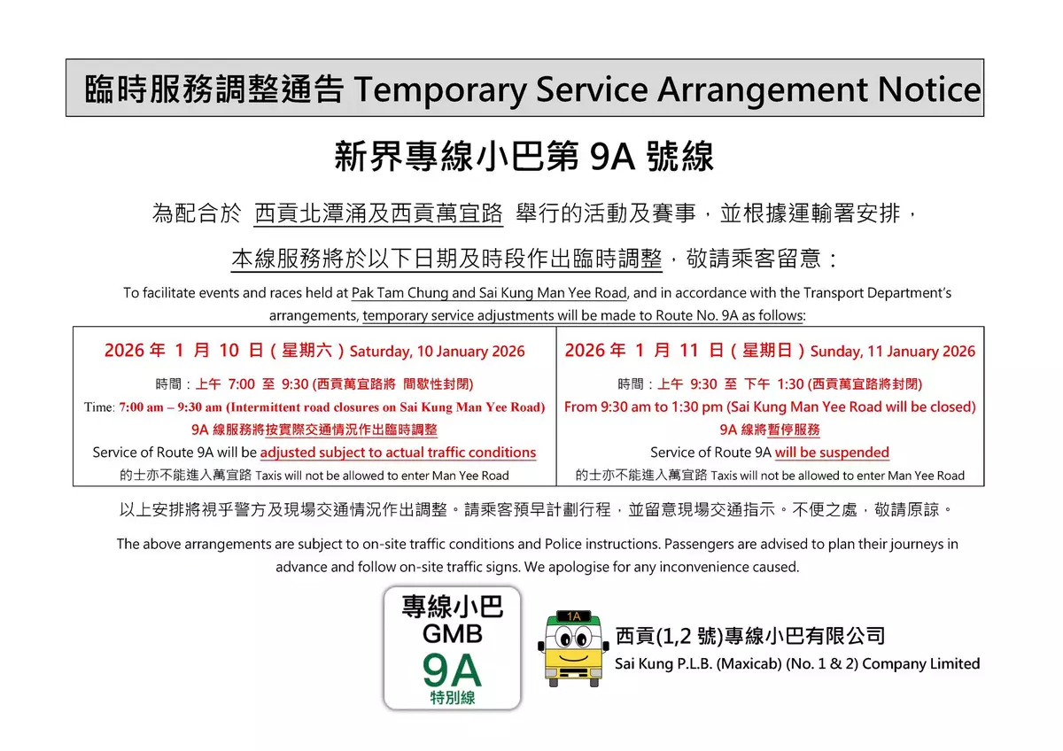 公共運輸方面,西貢萬宜路封閉期間,新界專線小巴第9A號線,即來往北潭涌—萬宜水庫東壩的專線,將由北潭涌開出的首班車起暫停服務至下午1時30分,而的士亦不能進入,直至道路重開為止。