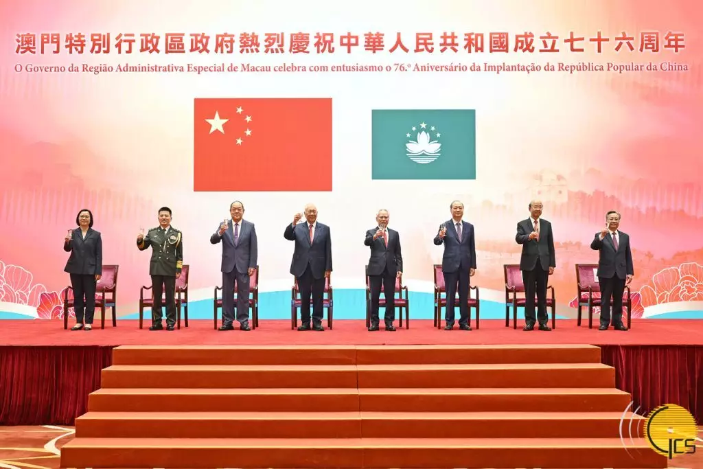 行政長官岑浩輝等主禮嘉賓在澳門特別行政區政府慶祝中華人民共和國成立76周年招待酒會上祝酒。澳門政府新聞局圖片