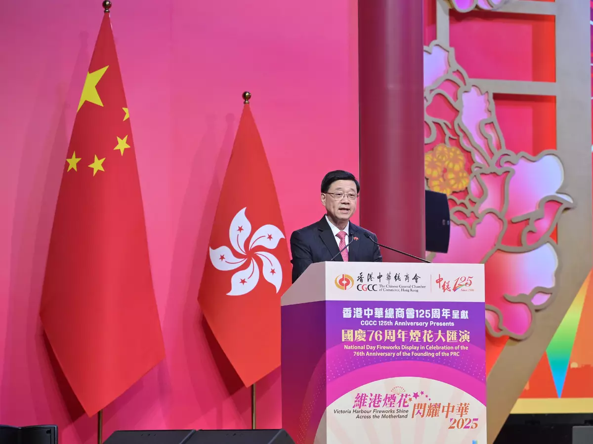 李家超在國慶76周年煙花大匯演致辭。政府新聞處圖片