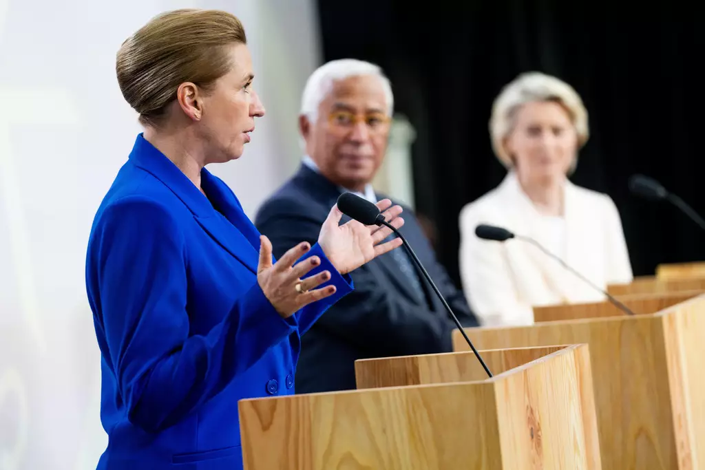 丹麥總理弗雷德里克森、歐洲理事會主席科斯塔和歐盟委員會主席馮德萊恩於星期三在哥本哈根克里斯蒂安堡宮舉行新聞發布會。AP圖片